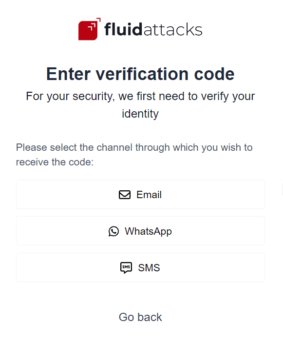 To log in to Fluid Attacks’ platform, go to app.fluidattacks.com . There, you will be prompted to continue with your corporate account and then enter a one-time password (OTP). This allows Fluid Attacks to strengthen the security of the authentication process, as it helps prevent unauthorized access.