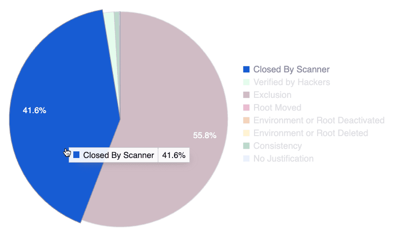 This chart shows the percentage corresponding to the reasons why the status of vulnerabilities in the group changed from “Vulnerable” to “Safe.” While closing sometimes happens after our reattacks verify that your team has fixed a vulnerability, it also happens, for example, when you deactivate or move a root .