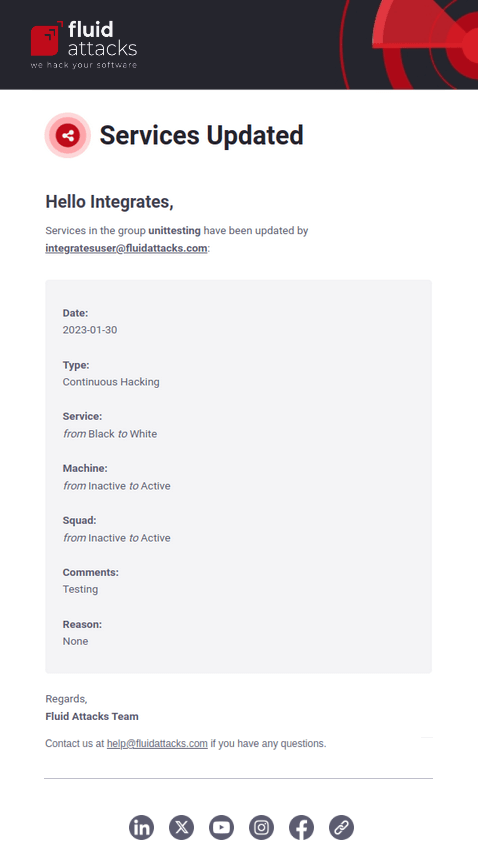The following are the descriptions of the types of notifications offered by Fluid Attacks.