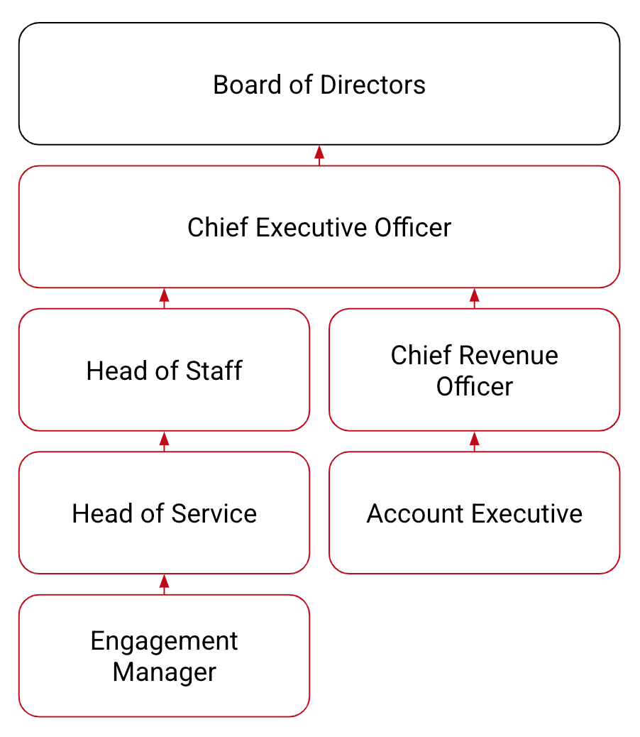 The escalation path may follow the matrix below. Each client is provided with the matrix, including the specific names and contact details of assigned Fluid Attacks staff.