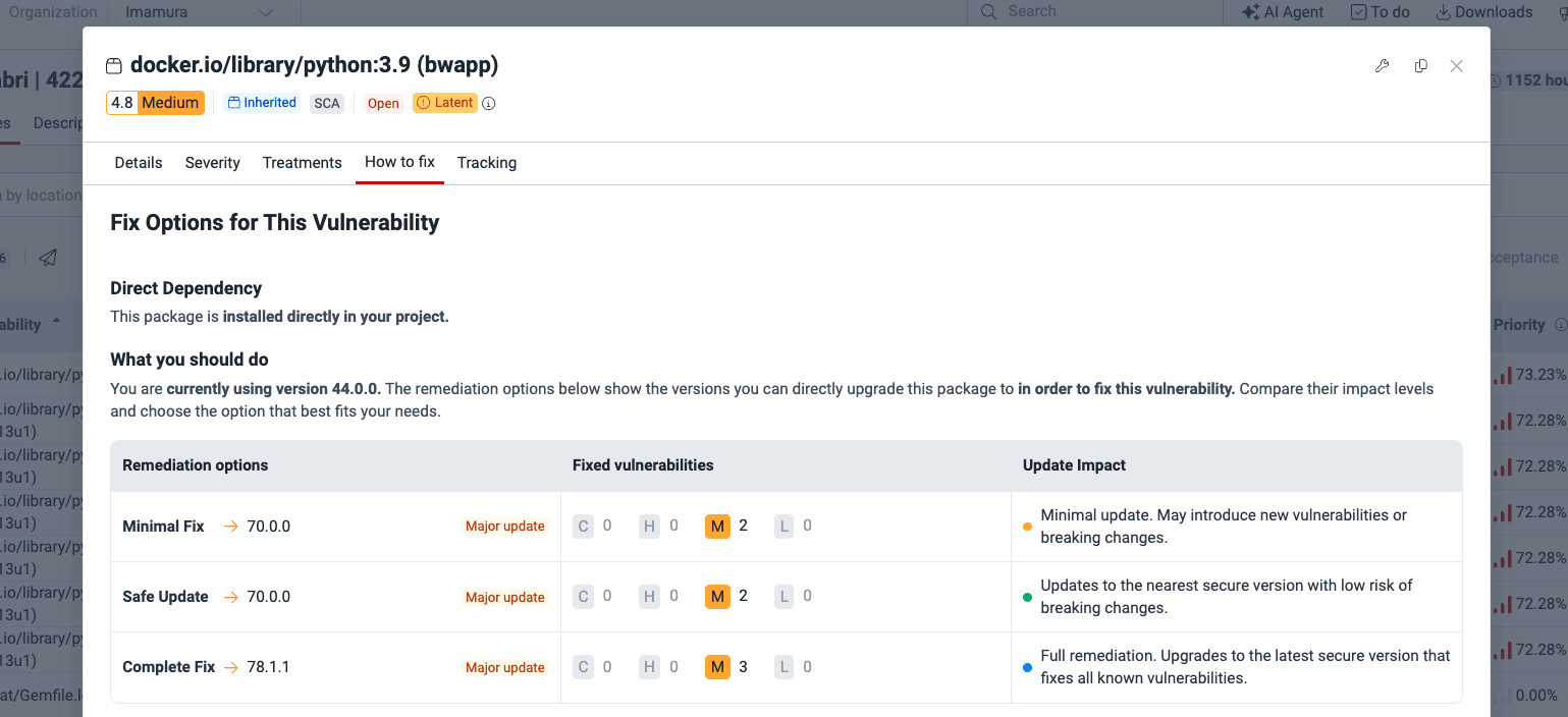 Fluid Attacks identifies vulnerable dependencies in your environment and provides intelligent upgrade paths. Instead of a single recommendation, you now receive three distinct options, allowing you to choose the best balance between security and stability for your specific situation.