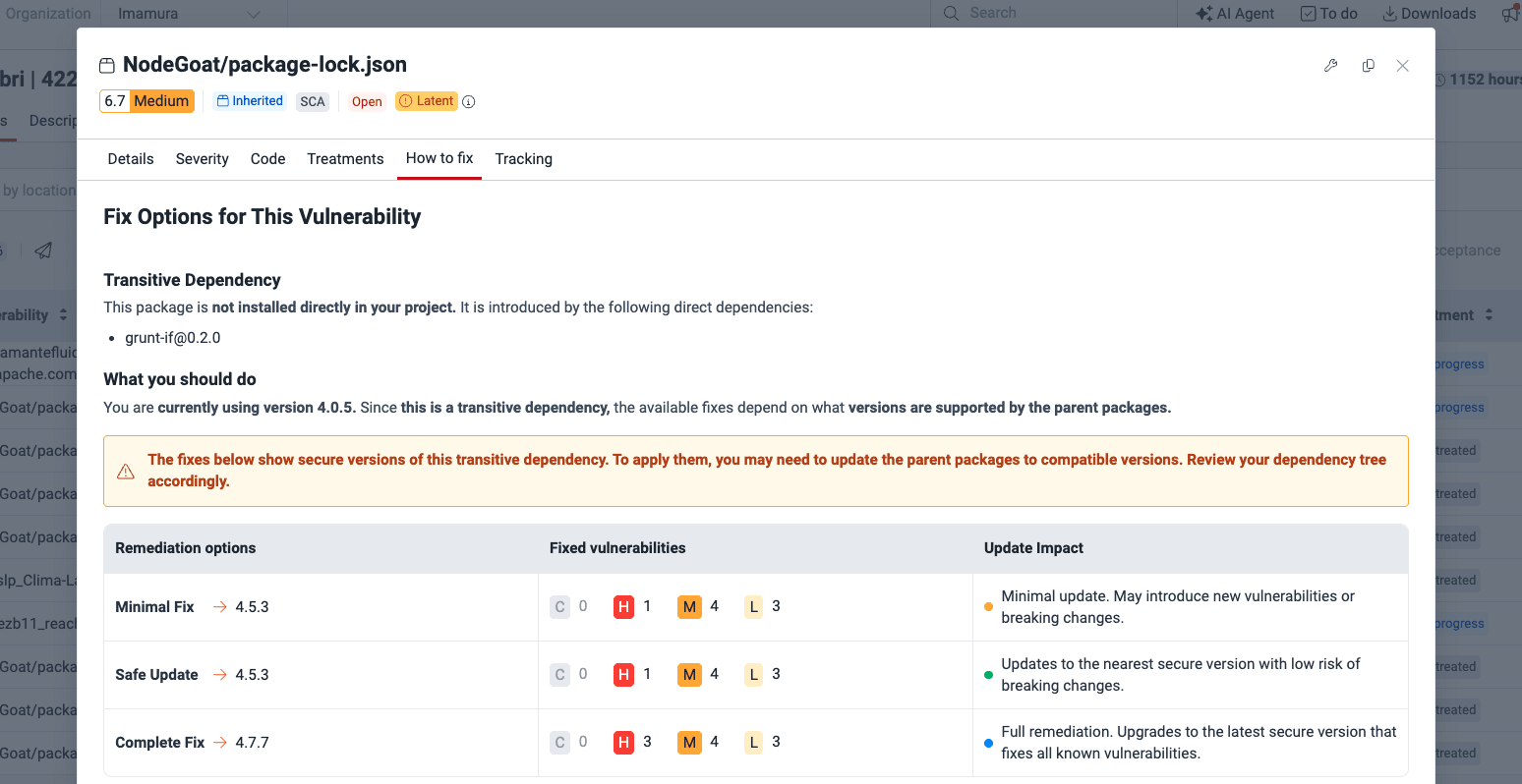 For vulnerabilities introduced by sub-dependencies, the platform identifies the direct package responsible for pulling in the vulnerable code. We provide the three remediation versions for the transitive dependency so you can verify parent compatibility or bump the parent package to the minimum supported version.